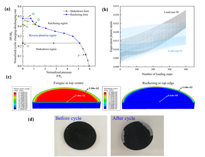 图2 (a) NMC正极材料涂层安定和棘轮极限边界 (b) 详细有限元分析验证安定和棘轮边界的准确性
