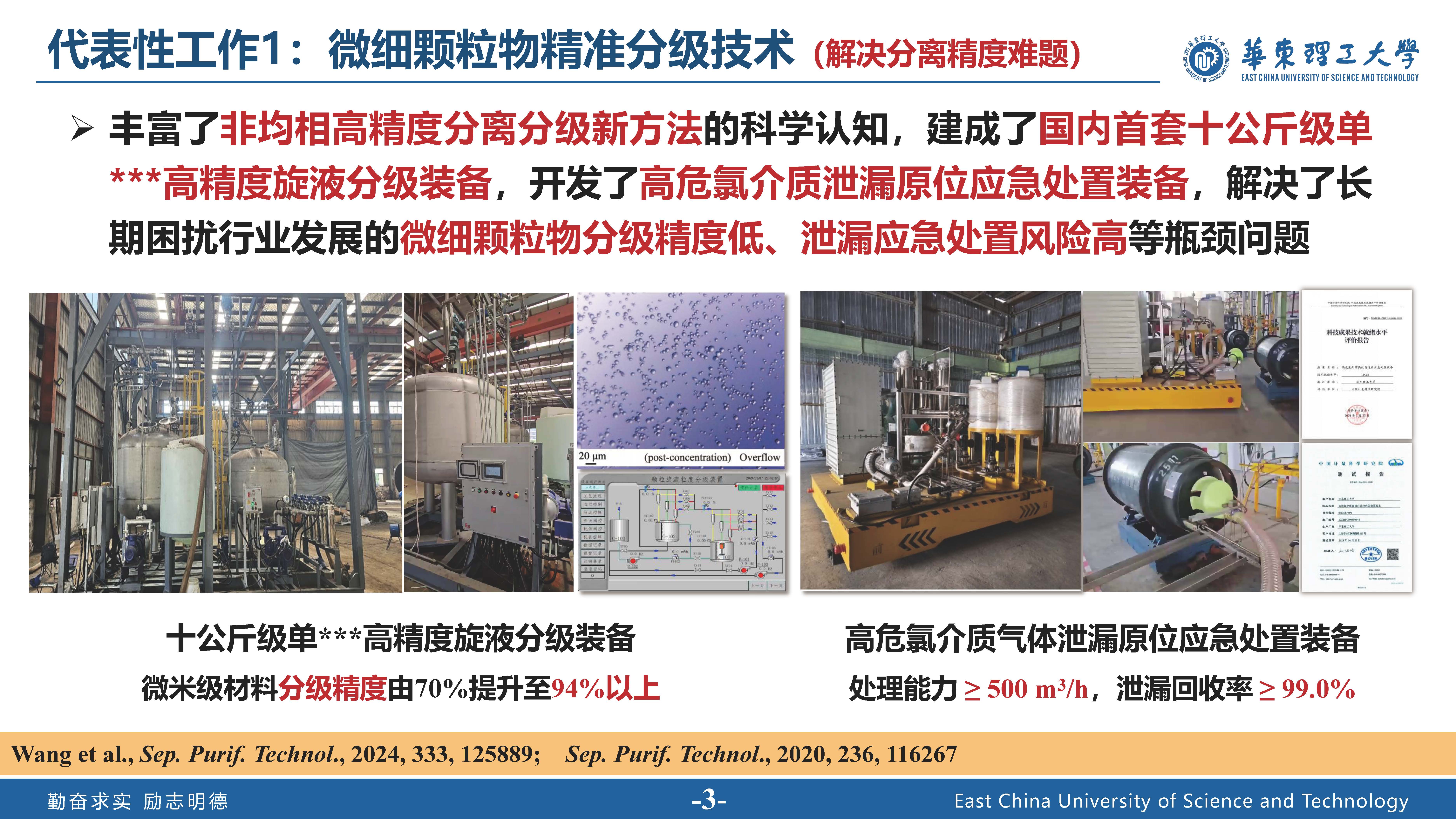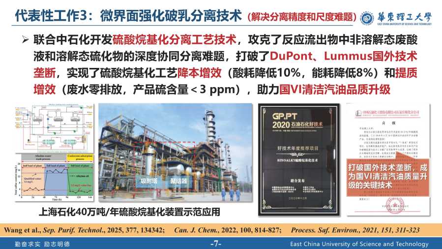 坚持面向科技前沿和国家重大需求,长期致力于非均相体系多维度、跨尺度、多物理场耦合的强化分离理论、技术和装备研发。先后入选上海市“超级博士后”人才激励计划(2019)、上海市青年科技英才扬帆计划(2020)。主持国家自然科学基金面上及青年项目、科技部国家重点研发计划(子课题)、国防科工局基础产品创新科研项目(课题)、中国博士后科学基金特别资助等国家级及省部级项目,以及中石油、中石化等企业委托的技术开发项目。迄今已发表学术论文近50篇,其中SCI收录40余篇,总影响因子300+,他引1000余次,包含Chemical Society Reviews 、Chemical Engineering Journal 、Journal of Hazardous Materials 等化学工程、环境工程、分离工程领域顶级期刊,1篇入选第五届中国科协优秀科技论文(全国共97篇,化学工程学科仅此1篇);申请中国发明专利22件,已授权18件,完成专利转化2件