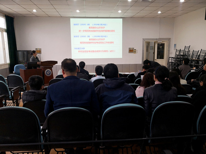 为深入学习贯彻全国教育大会精神,进一步规范和加强研究生招生、培养和管理各个环节,提升研究生培养质量,3月21日中午,伟德国际victor1946在学校实验十楼三楼会议室召开2019年度硕士研究生复试工作培训暨全体研究生导师会议。学院党委书记项延训、副书记杨倩、全体导师及参加2019年研究生复试的工作人员参加会议。会议由学院副院长章兰珠主持。
