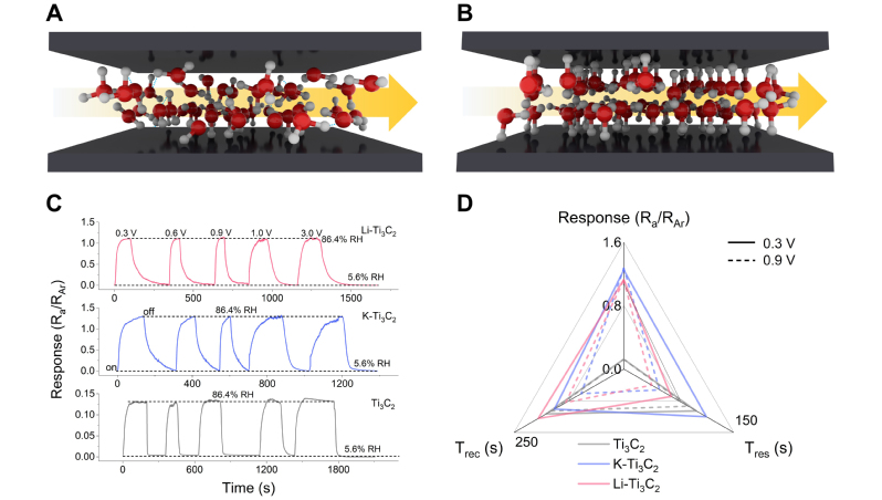 气湿敏传感器被广泛应用于现代工业、环境监测、农业、医疗和日常生活等领域。课题组针对当下气湿敏传感器仍存在无法及时捕捉气体浓度的变化且在检测低浓度分析物时灵敏度较低等问题,无法满足极端环境中的应用需求,创新性提出一种二维流体限域传感策略,采用一种具有分层结构的二维过渡金属碳化物(Ti3C2 MXene)提供二维敏感通道,通过结合金属阳离子和电场操纵的概念同时优化传感器的响应和恢复速度。研究人员结合分子动力学模拟、第一性原理计算、多物理场仿真以及原位光谱实验等多重手段,发现低电流会导致水分子极化,从而引起限域水在二维通道内的有序密集排列,而高电流会诱导限域水解离而聚集成大分子簇,堵塞二维通道;通过电场和阳离子调控,促使二维限域水在三种结构类型之间的平衡转变:单体 ⇋ 二聚体 ⇋ 团簇。该策略能够快速调节限域分子在二维通道中的传输动力学,有望在传感、水处理、气体分离、能源存储与转换等领域产生广泛应用。