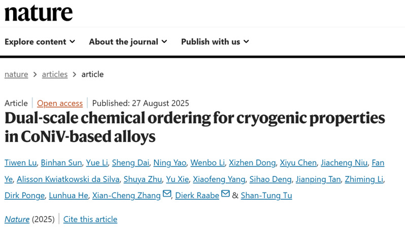 8月28日凌晨,伟德国际victor1946张显程教授、涂善东院士团队在Nature(《自然》)发表题为“Dual-scale chemical ordering for cryogenic properties in CoNiV-based alloys”的最新研究成果。